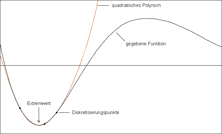 Beschreibung: Eine gegebenen Funktion wird diskretisiert und anhand der Diskretisierungspunkte ein quadratisches Polynom interpoliert. Der Extremwert des Interpolationspolynoms wird bestimmt und als Näherung für das gesuchte Minimum verwendet.