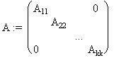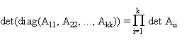Die Untermatrizen A11,...,Akk sind alle quadratisch, besitzen aber nicht unbedingt alle dieselbe Größe. Viele Eigenschaften von Blockdiagonalmatrizen verallgemeinern die Eigenschaften der Diagonalmatrizen, wie zum Beispiel: