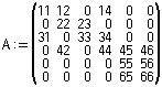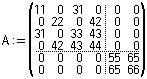 An der Beispielmatrix A ist noch etwas besonderes, auf daß man in der Praxis aufpassen sollte. Diese Matrix zerfällt in zwei unabhängige Teilsysteme (angedeutet durch die punktierten Linien). Natürlich sind die Teilsysteme jedes für sich in Summe viel effizienter (Speicherplatz und Rechengeschwindigkeit) lösbar als die gesamte Matrix.