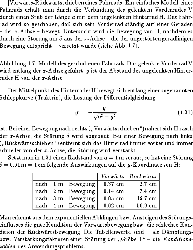 In diesen Fällen ist es oft besser, einen mathematisch-rechnerischen Weg nicht zu folgen.Es gibt aber Stiuationen, wo erst nach erfolgter Modellbildung eine Konditionsuntersuchung des mathematischen Problems erkennen läßt, daß schlechte Kondition des untersuchten Vorgangs vorliegt. In manchen Fällen kann sich das mathematische Problem als schlecht konditioniert ausstellen, obwohl das reales Problem gut konditionirt ist. Der Grund dafür: Bei der Modellbildung hat das Problem seinen Charakter verändert.Als Ergebnis kann man sagen, daß sorgfältigere Modellbildung zu einem besser konditionierten mathematischen Problem führt.