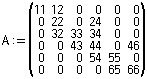 An der Beispielmatrix A ist noch etwas besonderes, auf daß man in der Praxis aufpassen sollte. Diese Matrix zerfällt in zwei unabhängige Teilsysteme (angedeutet durch die punktierten Linien). Natürlich sind die Teilsysteme jedes für sich in Summe viel effizienter (Speicherplatz und Rechengeschwindigkeit) lösbar als die gesamte Matrix.